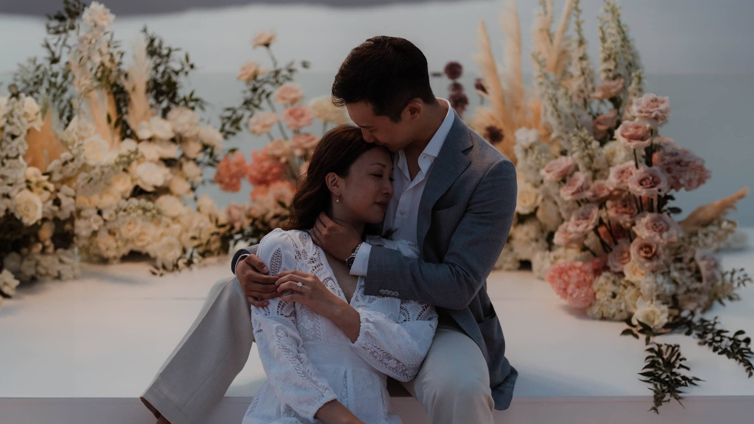 Josh didn't just want a proposal; he wanted a production that rivaled a wedding. Picture this: a seven-meter mirror isle, extravagant flower setups, a trio of musicians, and a spectacular fireworks display – all carefully placed on the very edge of the caldera.
