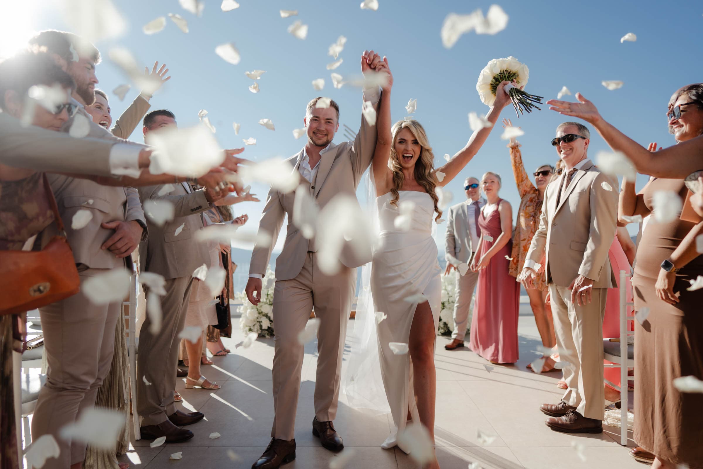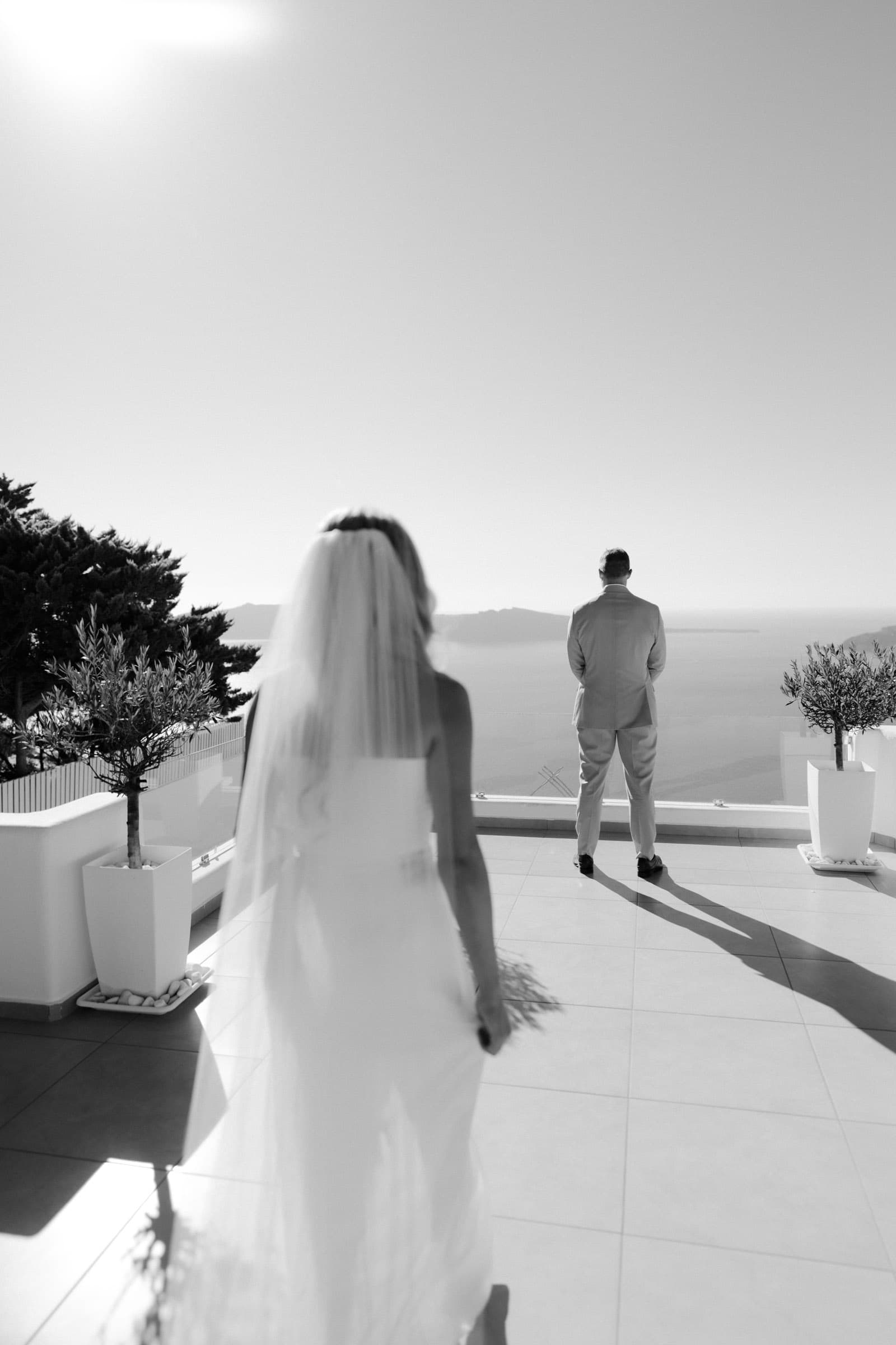 The ceremony was held at Le Ciel, a beautiful venue overlooking the caldera. The day wrapped up with ground fireworks and an epic wedding dip kiss.